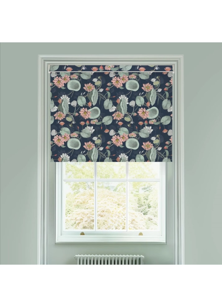 A smart blue background is the pond like background for floating waterlily florals and lilipads. The aqua green leaves and blush pink florals contrast beautifully with the almost navy blue base to create a blind that is truly chic and sophisticated.